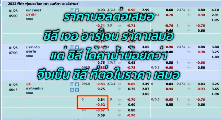 สาเหตุที่เรียกกันว่า ต่อเสมอเพราะว่ามันจะต้องมีทีมใดทีมนึงที่ได้ค่าน้ำน้อยกว่านั่นเอง อย่าในรูป ชิลี เจอ อาร์เจนติน่า ราคาเสมอ ชิลี ได้ค่าน้ำที่ 0.84 ส่วน อาร์เจนติน่า ได้ค่าน้ำที่ -0.92 ซึ่งถ้าเป็นราคาในโพยบอลจะเรียกราคานี้ว่า ชิลี ต่อเสมอ +10 ครับ