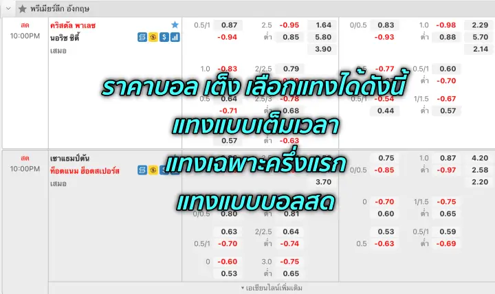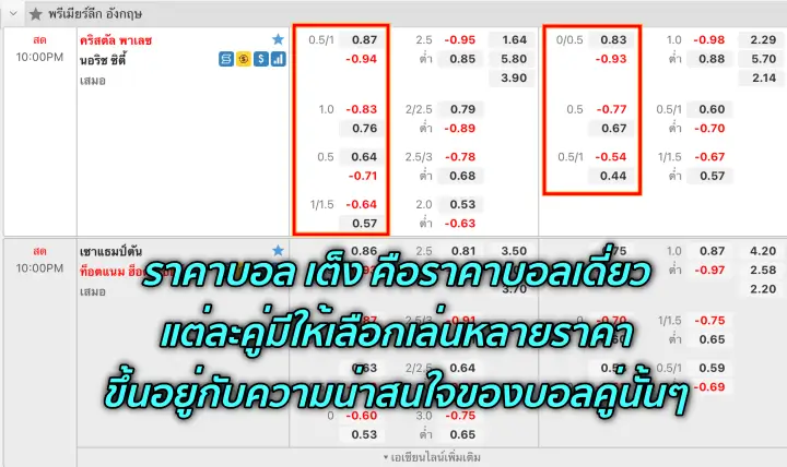 โดยราคาบอลเต็งนั้นจะอยู่ที่ด้านหน้าสุดเลยครับ โดยจะมีราคาให้เลอืกเล่นในแต่ละคู่มากหรือน้อยขึ้นอยู่กับความน่าสนใจ อย่างพวกลีกใหญ่ใหญ่ อย่าง พรีเมียร์ลีก อังกฤษ ลา ลีกา สเปน กัลโช่ เซเรียอา อิตาลี่ รวมทั้ง บุนเดสลีกา เยอรมัน จะมีให้เลอืกเล่นถึง 4 ราคาด้วยกัน เลือกเอาได้เลย