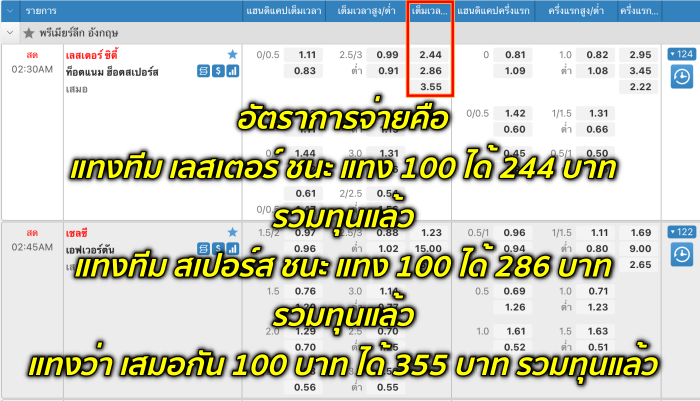 โดยถ้าเราแทงทีม เลเตอร์ ซิตี้ ว่าเป็นผู้ชนะด้วยเงิน 100 บาท เราจะได้เงินกลับมาที่ 244 บาท รวมทุนแล้ว ถ้าเราเลือกแทงทีม ท็อตแน่ม ฮ็อตสเปอร์ ว่าเป็นผู้ชนะ ด้วยเงิน 100 บาท เราจะได้เงินกลับมาที่ 286 บาท รวมทุนแล้ว แต่ถ้าเราแทงว่าทั้งสองทีมจะเสมอกัน ด้วยเงิน 100 บาท เราจะได้เงินกลับมาที่ 355 บาท รวมทุนแล้ว